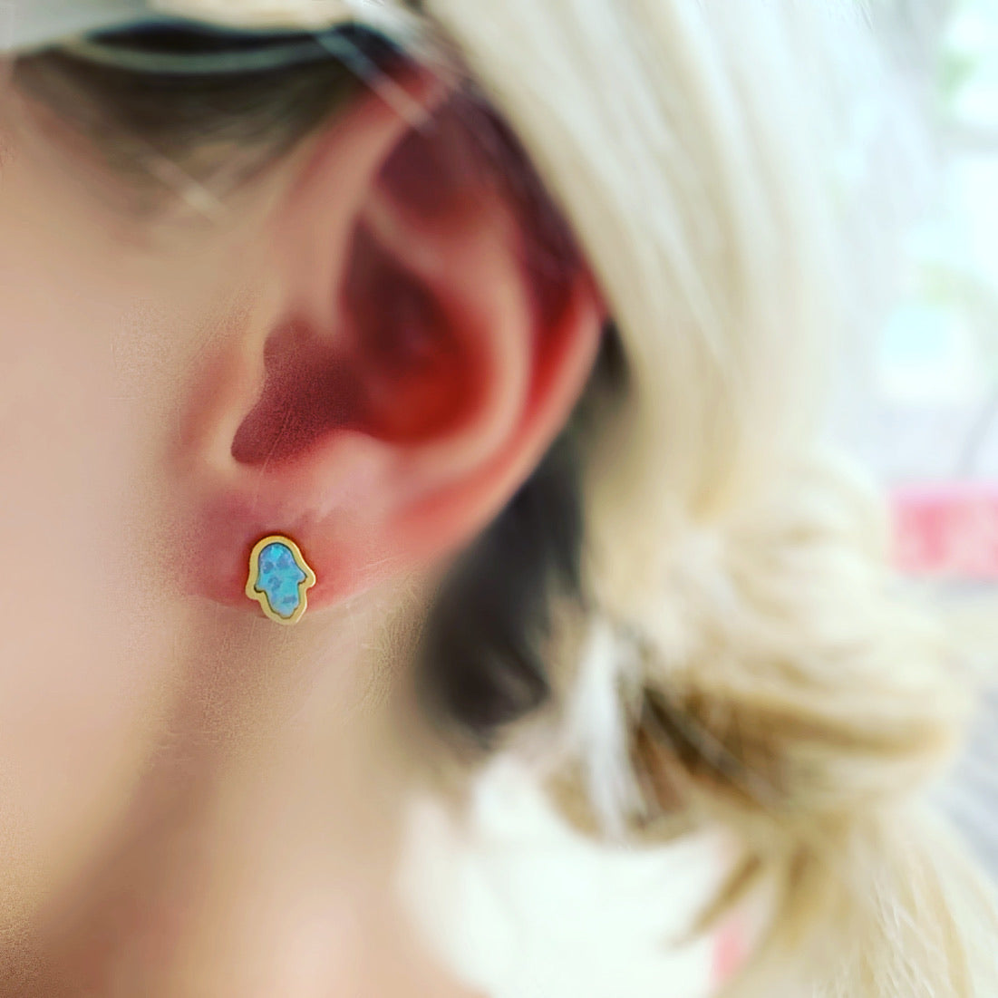 Cute Hamsa studs with lab created opal stones.